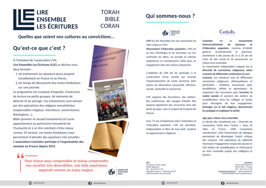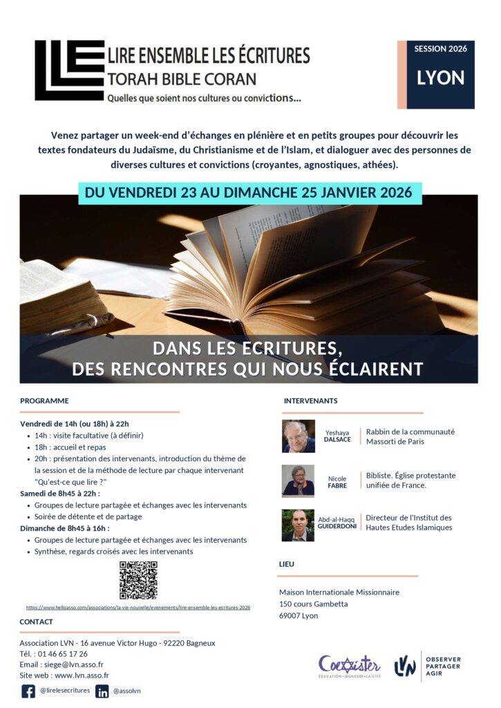 Juifs, Chrétiens et Musulmans, croyants, agnostiques ou athées se retrouvent pour lire ensemble et interroger leurs textes fondateurs sur le thème : dans les Ecritures, des rencontres qui nous éclairent.